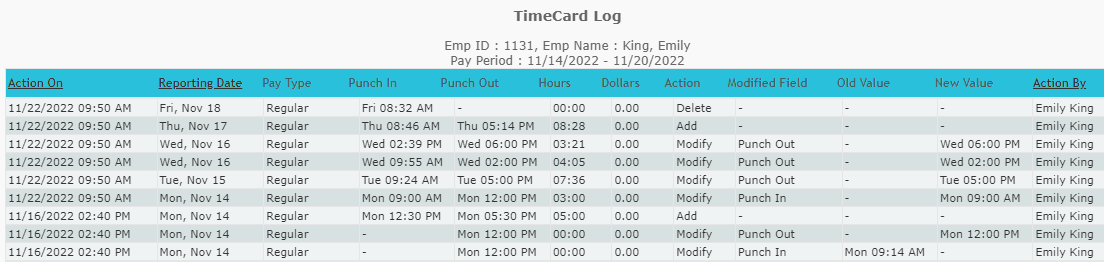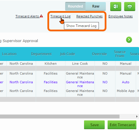 To view details of the manual changes, click Timecard Log above the timecard. Timecard Log displays a list of manual changes, including the name of the user that made the changes and when they made them. | ![]() |