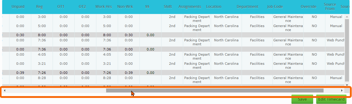 The Source From and Source To fields indicate which time entry has been modified. Use the scroll bar at the bottom of the timecard to navigate to the Source fields.