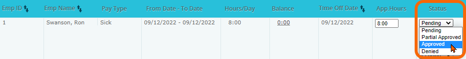 5) Use the dropdown menu in the Status column to select Approved or Denied status to apply to the request.