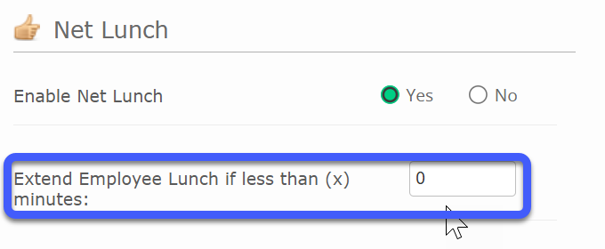 Net Lunch automatically extends lunch time to a configurable lunch duration rather than calculating lunch time based on exact punch lengths.
