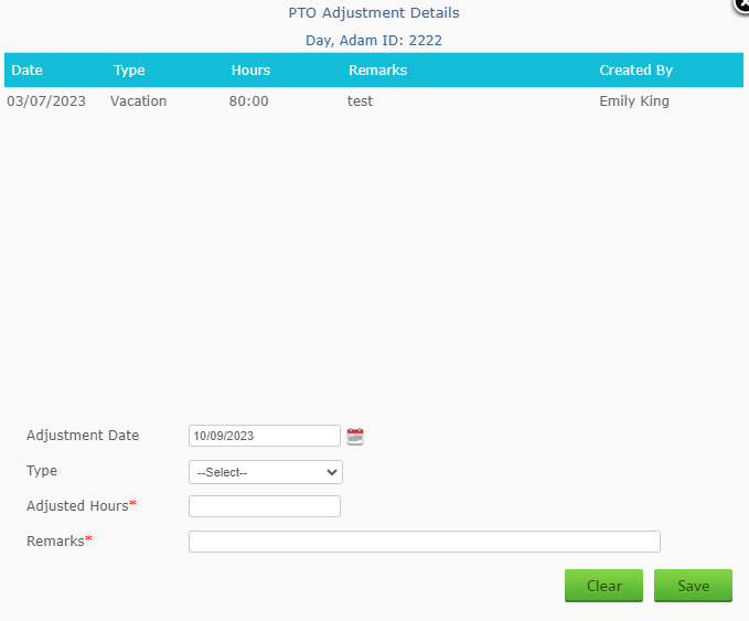 A record of the adjustment will be added to the list of all previous PTO Adjustments made for the selected employee. Entries with the most recent Adjustment Date will appear at the top of the list.