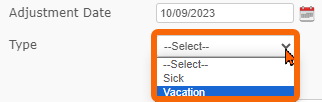 | 7) Use the Type dropdown menu to select the leave type to which you want to make the adjustment. | ![]() |