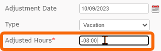 | 8) Enter how many hours you want to add or subtract from the employee's balance for the selected leave type. To subtract hours, enter "-" before the number. | ![]() |