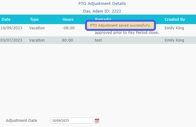 A message will display near the top of the Adjustment Details window that the PTO Adjustment saved successfully.