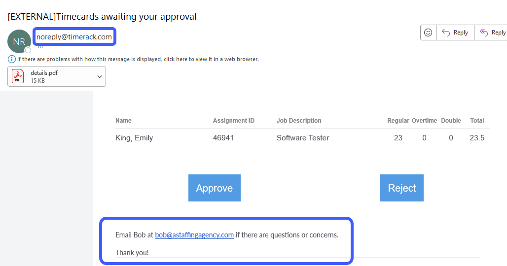Email Timesheet Approval enables staffing agencies to efficiently send time data to approvers who do not have access to Timerack. The email recipient approves or rejects the hours outside of the Timerack portal and the approval status displays on the employee's Timecard.