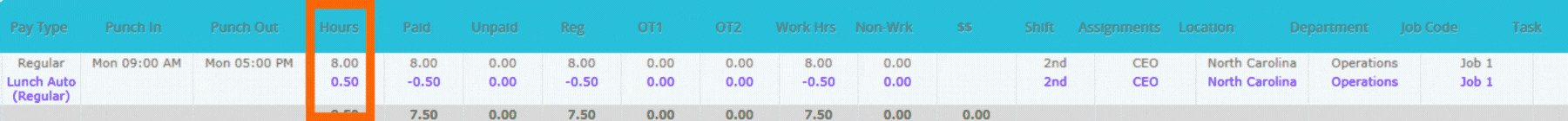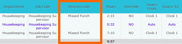 • MOVED the 'Hours' column to the right. 'Hours' is now located between 'Reason Code' and 'Override.'