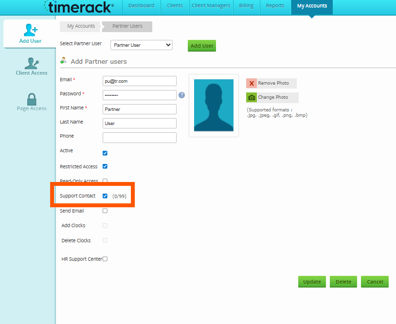 • Partner Users & Manager Users who have permissions enabled to edit the Partner and Manager User pages are now able to identify users who are dedicated support contacts- this is defined by members of their company that can reach out to Timerack support to ask questions or make changes in the system.