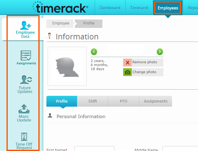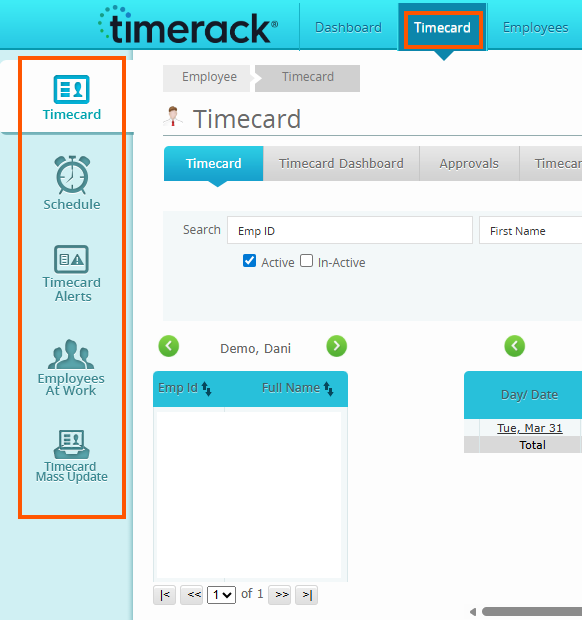 • NEW Employees tab at the top navigation bar to the right of Timecard. When the Employees tab is selected, the following will appear on the left side navigation menu and no longer appear under Timecard navigation:
